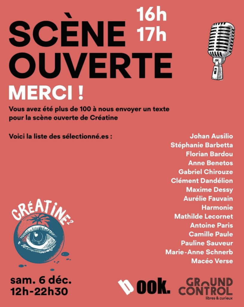 scène ouverte, lectures poésie contemporaine, 15 auteur-ices invité-es